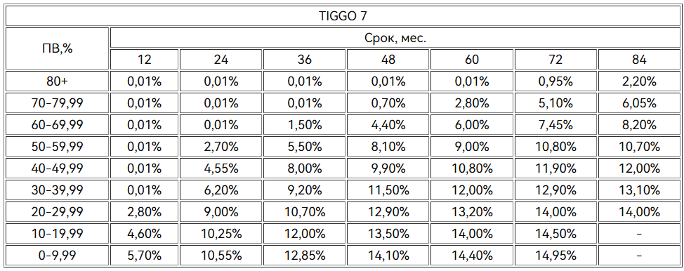 *0,01% - процентная ставка по акционной программе кредитования «Chery Direct NEW» для владельцев «Карта Халва» (далее – акционная программа) по продукту «АвтоСтиль-Особый» для новых автомобилей марки Tiggo 7 2024-2025 года выпуска. Параметры акционной программы: срок кредита –12, 24, 36, 48, 60, 72, 84 мес.; сумма кредита - от 300 000 до 9 000 000 руб.; полная стоимость кредита на момент оформления Договора – от 0,010% до 20,941% годовых, процентная ставка – от 0,01 до 14,95% годовых, первоначальный взнос – от 0% от цены приобретаемого автомобиля (при сроке от 73 мес минимальный ПВ от 20%). Процентная ставка 0,01% действует при сроке кредита 12 мес. и первоначальном взносе от 30 %, при сроке кредита 24 мес и первоначальном взносе от 60%, при сроке кредита 36месяцев при первоначальном взносе от 70%, при сроке кредита 48-60 месяцев и первоначальном взносе от 80%, Процентная ставка по кредиту, установленная акционной программой, действует при совершении в каждом полном отчетном периоде по «Карта Халва» в течение действия кредитного договора от 10 покупок на общую сумму от 20000 руб. При несоблюдении условий акции – действующая процентная ставка увеличивается на 6 процентных пунктов. Срок акции – с 29.01.2026 г. по 31.12.2026 г. Информация об организаторе акции, о правилах ее проведения, иные условия акции указаны в Паспорте акции «Автокредит с Халвой» по ссылке https://sovcombank.ru/credits/auto (вкладки «Кредитные программы»/»Акции»). В залог предоставляется приобретаемый автомобиль. Кредит предоставляется ПАО «Совкомбанк» (генеральная лицензия Банка России № 963 от 05 декабря 2014 года). Оценивайте свои финансовые возможности и риски.