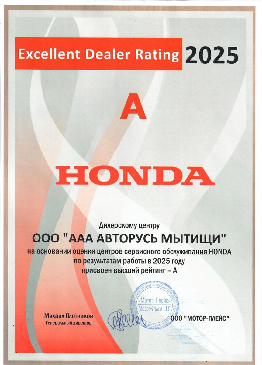 Сервисный центр HONDA АВТОРУСЬ Лосиный Остров был удостоен высшего рейтинга “А” на основании оценки центров сервисного обслуживания HONDA по версии Excellent Dealer Rating 2025 от ООО “МОТОР-ПЛЕЙС”.